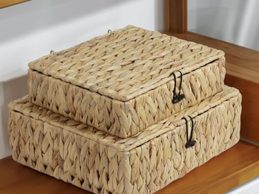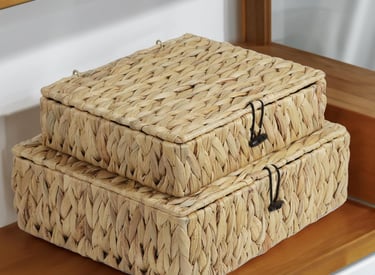 Juego de 2 cestas de mimbre con tapa, ideales para organizar ropa, juguetes o accesorios, aportando un toque natural y elegante a tu hogar.